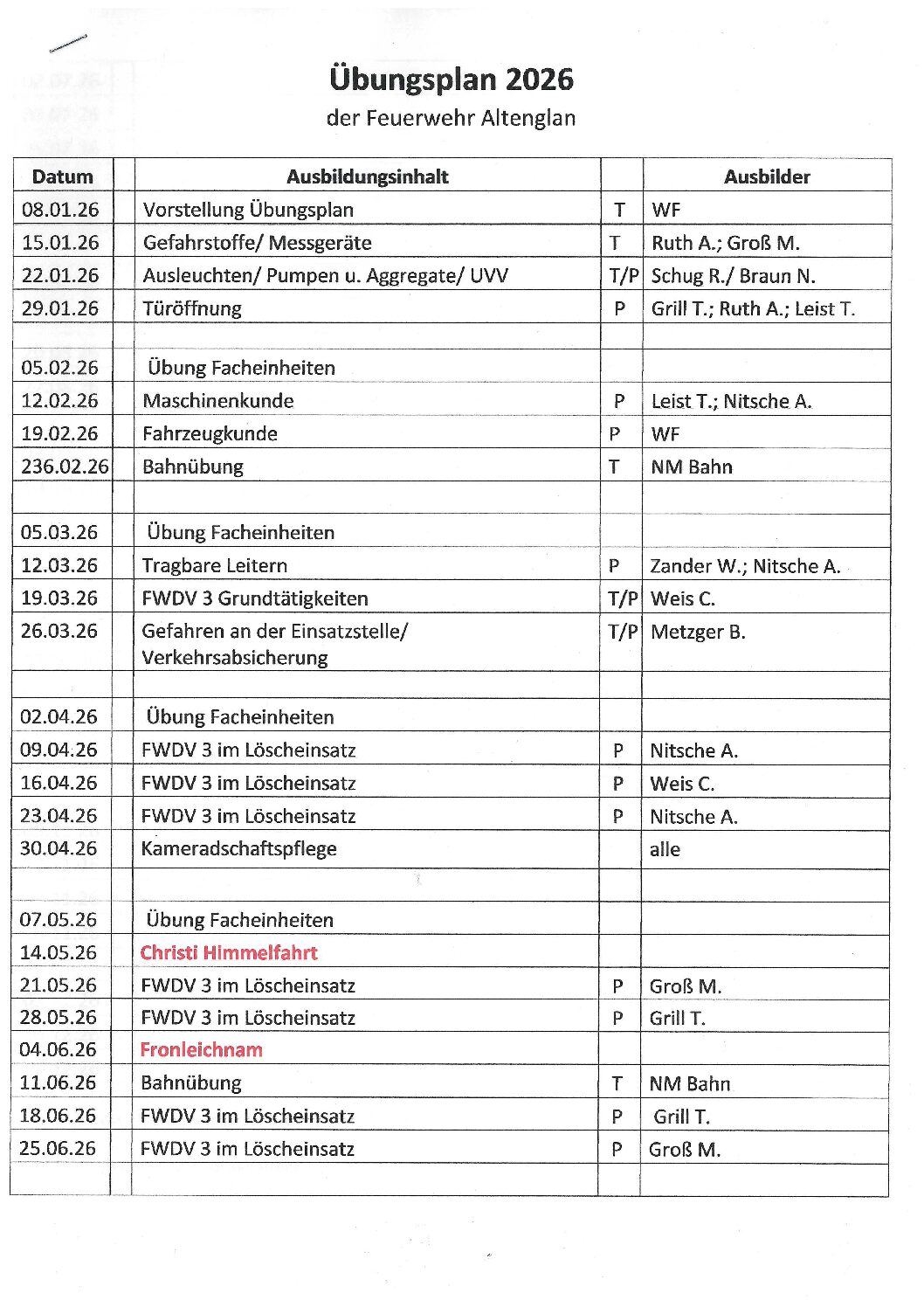 Auf dieser Seite präsentieren wir den aktuellen Übungsplan der Freiwilligen Feuerwehr Altenglan. Der Übungsplan enthält alle anstehenden Termine, von regelmäßigen Ausbildungsübungen bis hin zu speziellen Schulungen und Sonderveranstaltungen.
